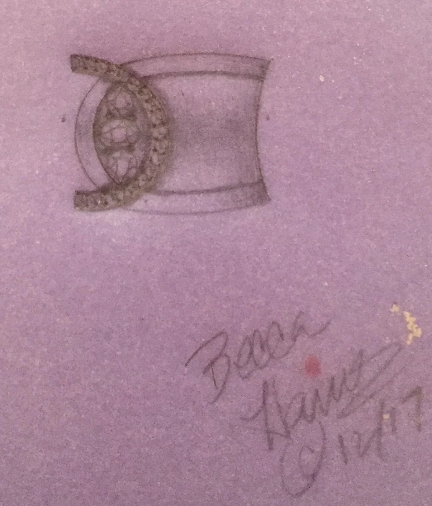 We meet and talk—not just about jewelry, but about your lifestyle, your story, your favorite shapes, numbers, even architecture. Anything that reflects you. Then I take that inspiration and sketch by hand, pencil on vellum. We refine the design together, and once it's just right, we move to 3D CAD renderings and into final production.